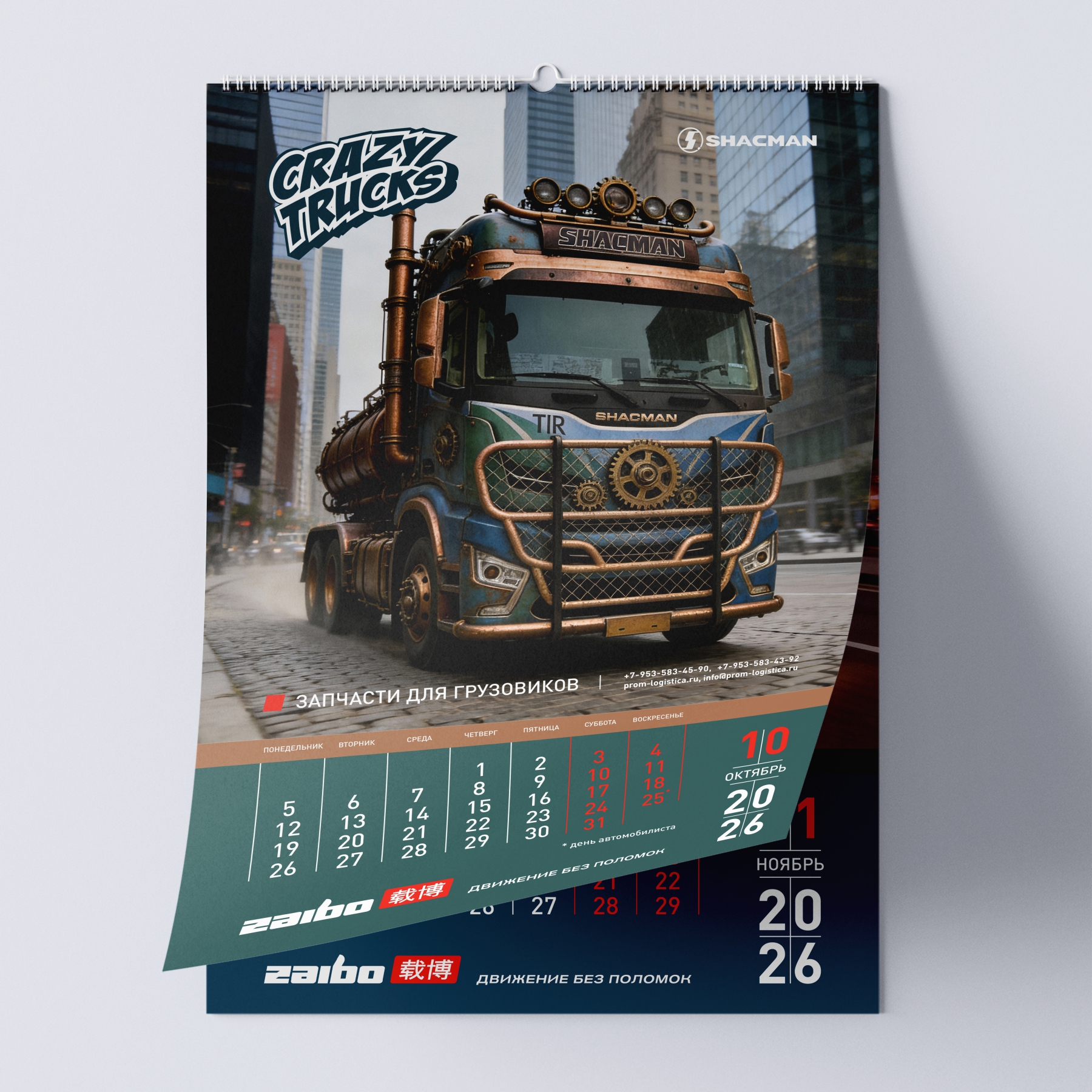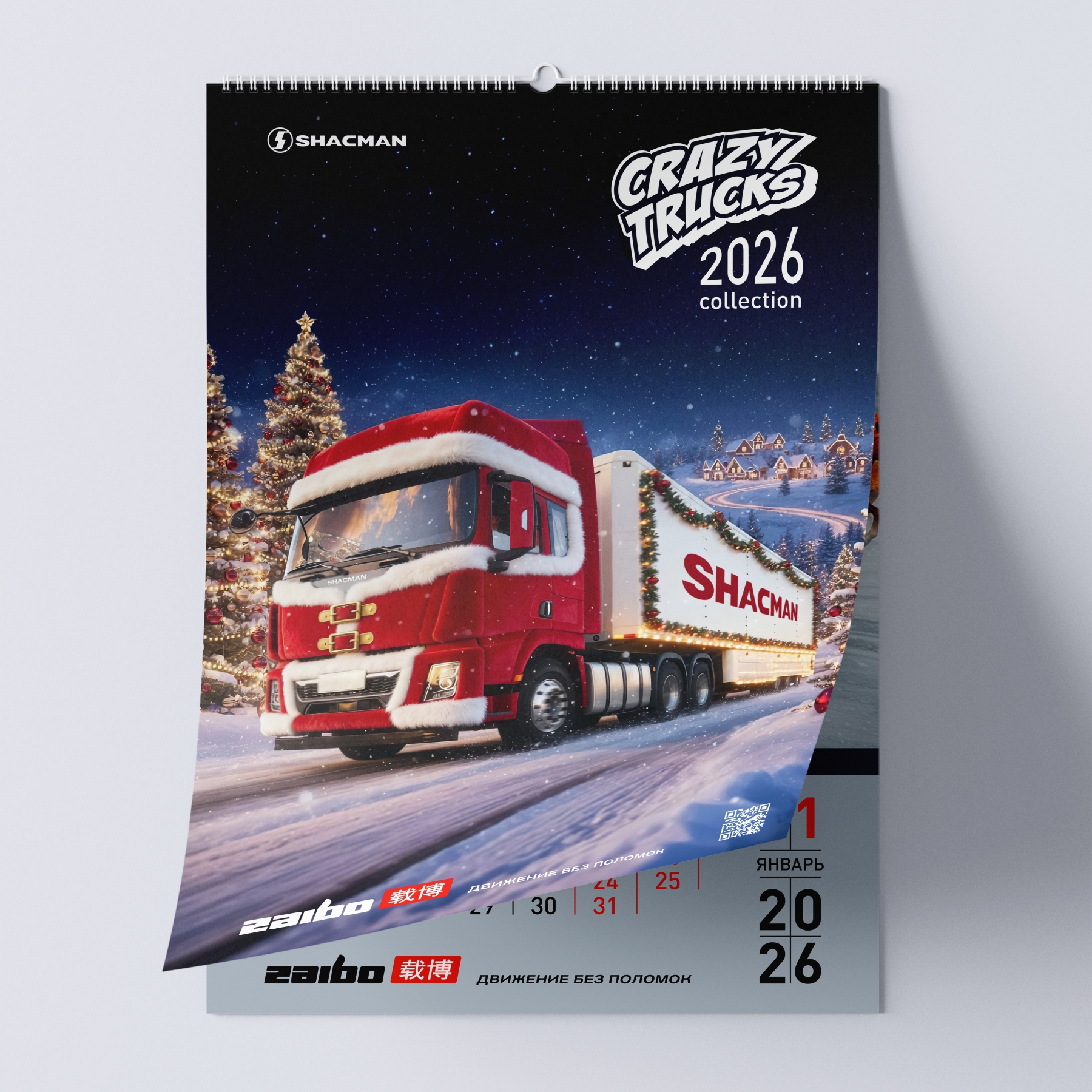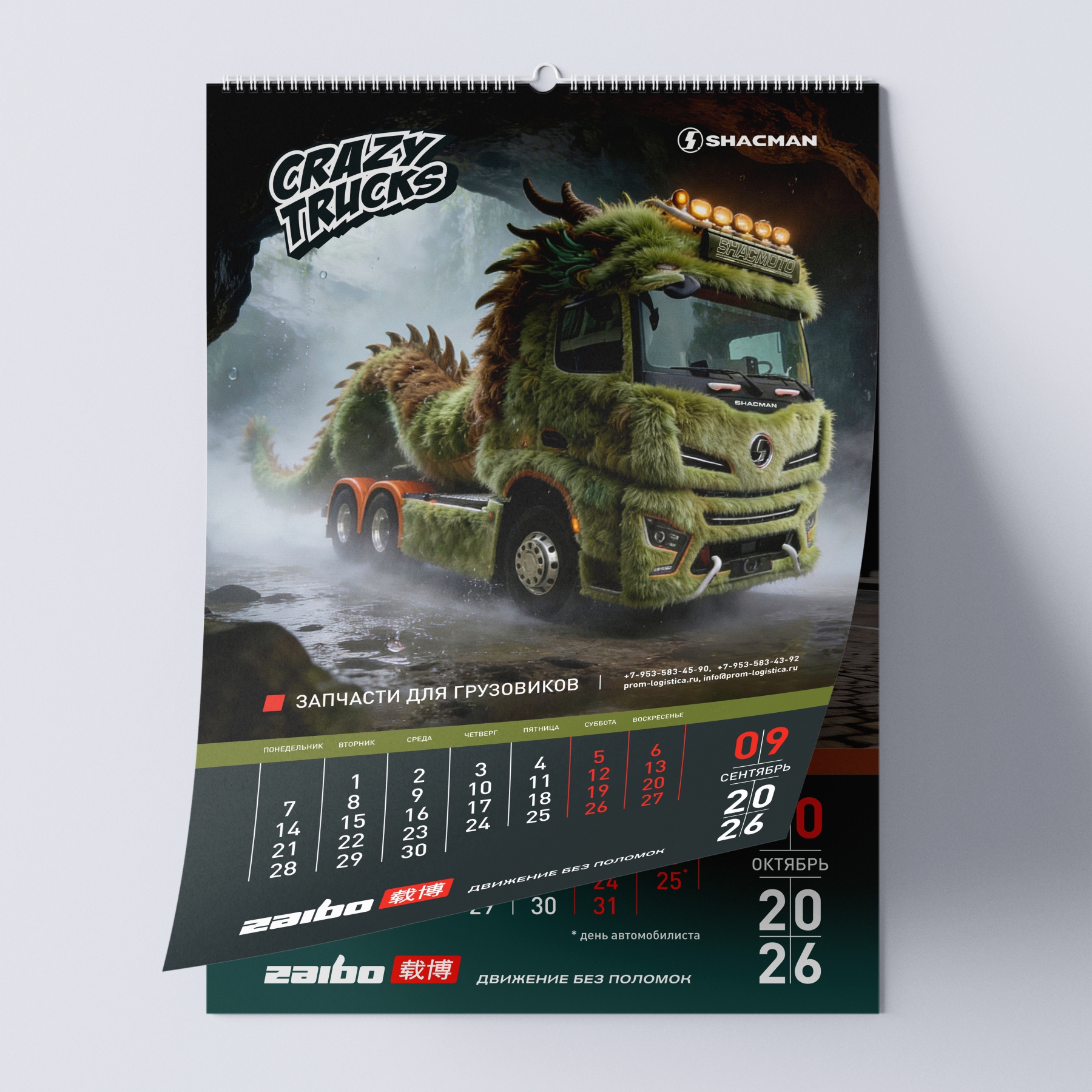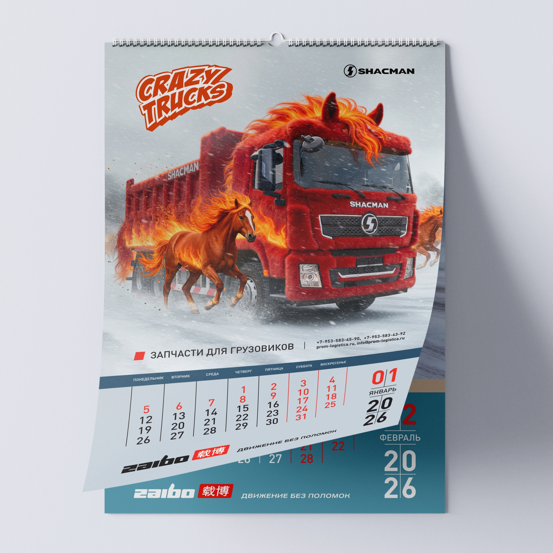 Наш кейс: создание перекидного календаря на 2026 год для бренда спецтехники ZAIBO. Уникальная концепция — 12 артов на основе фото грузовиков SHACMAN, стилизованных под дракона, огненную лошадь и других существ.