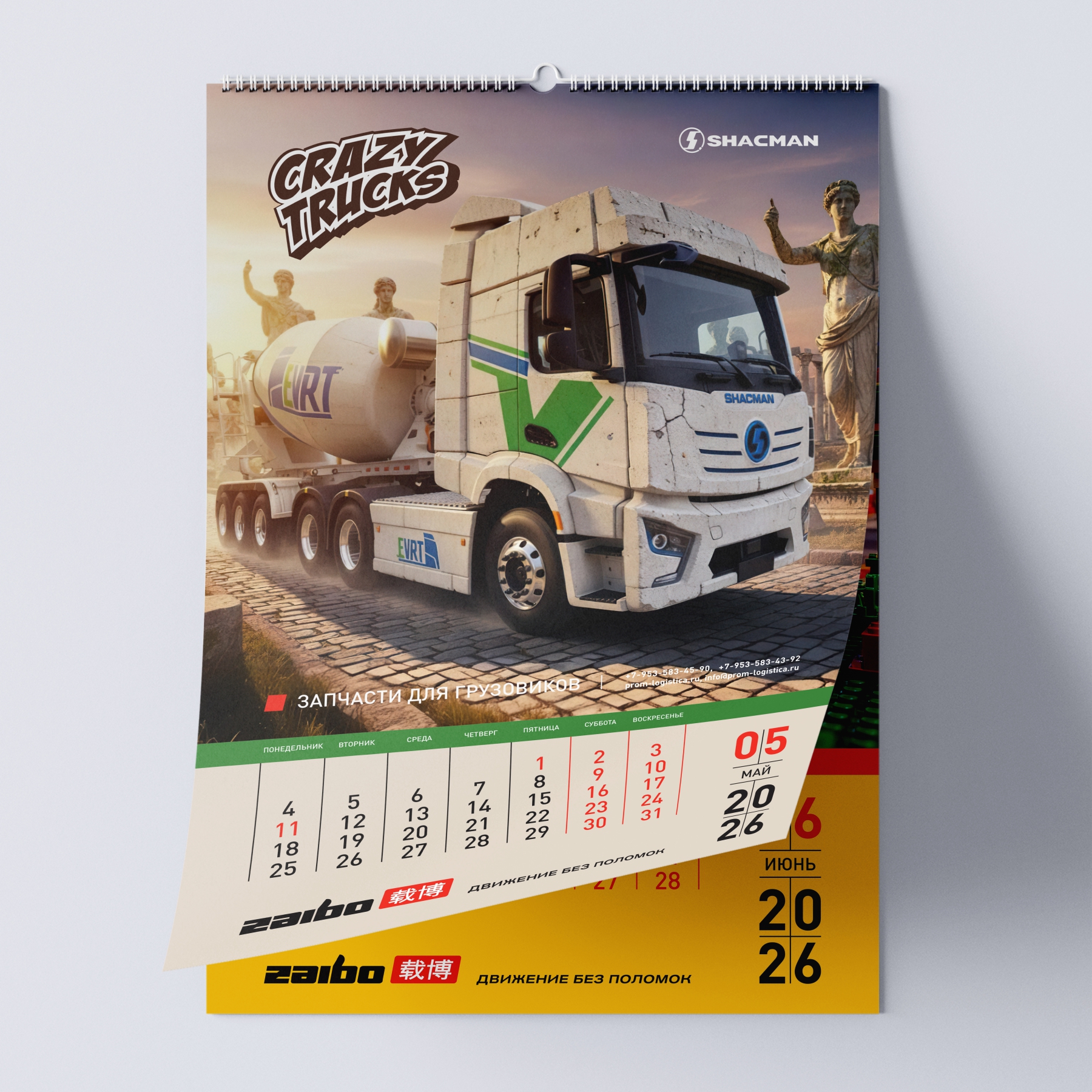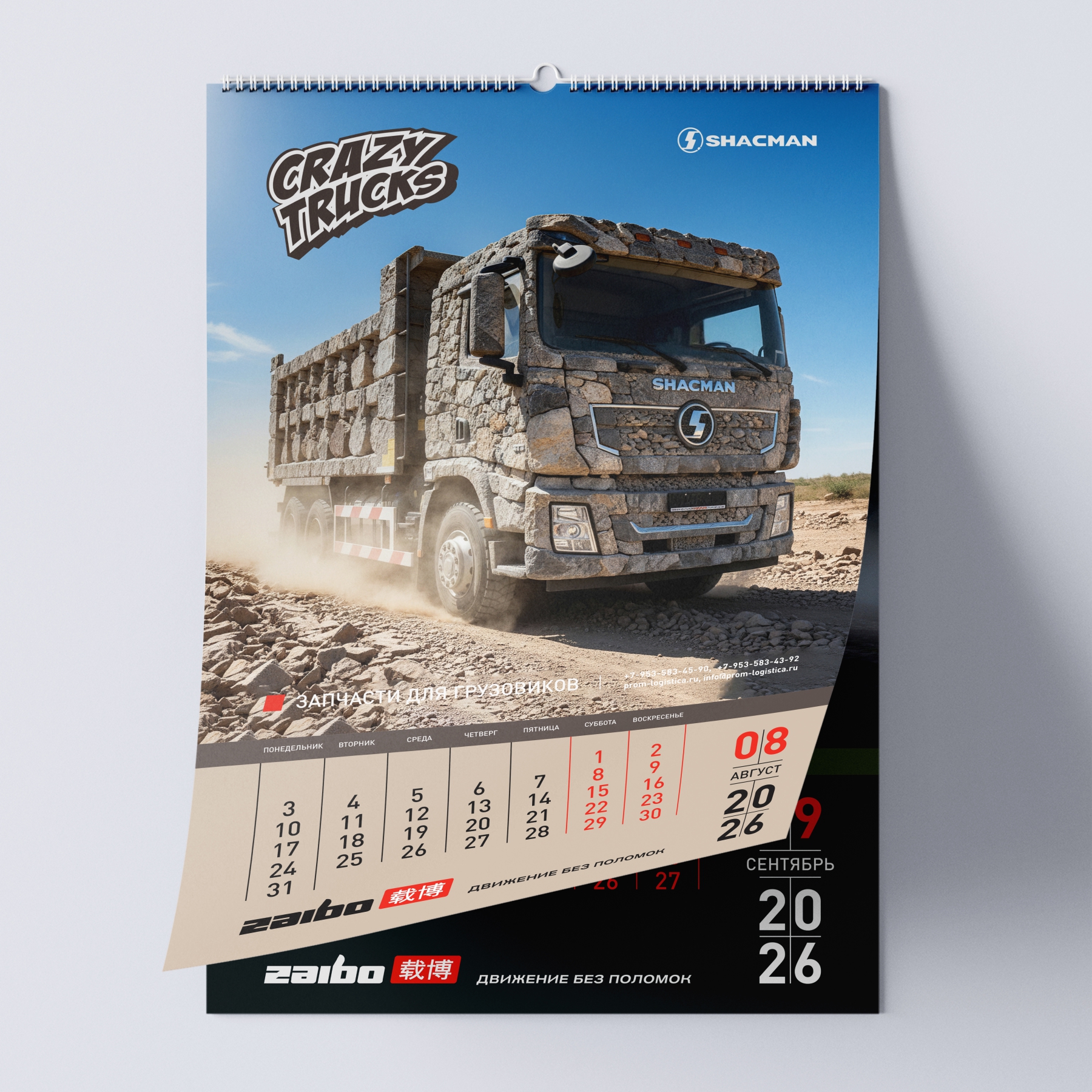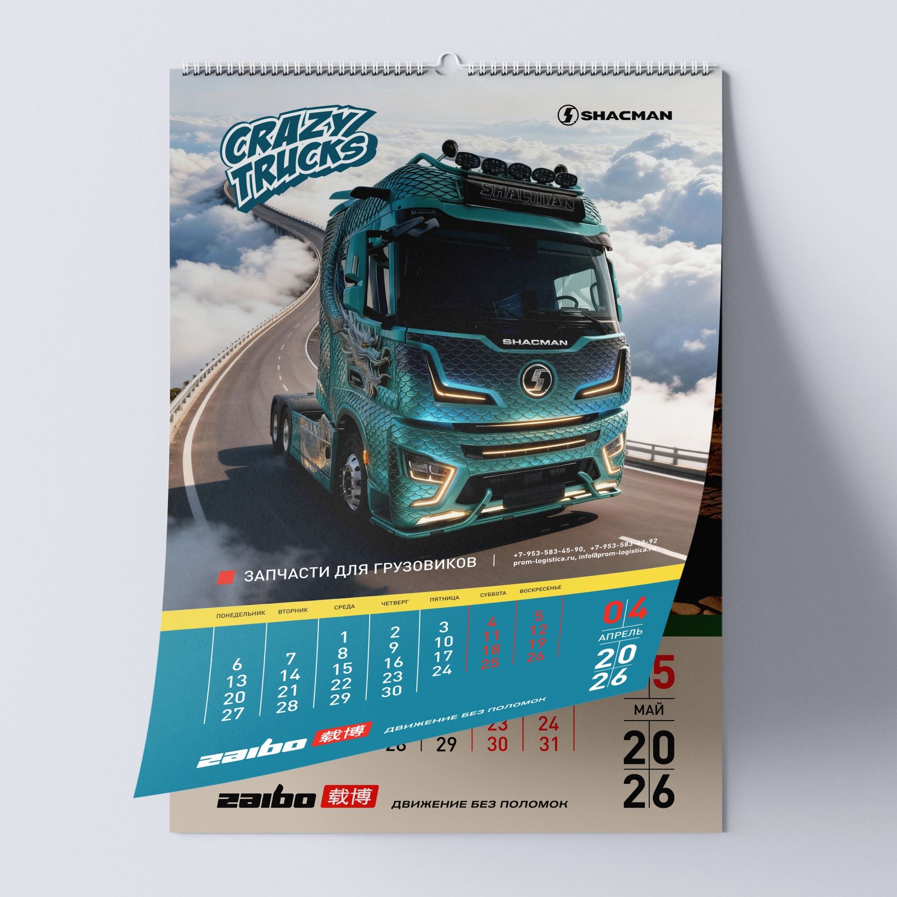 Наш кейс: создание перекидного календаря на 2026 год для бренда спецтехники ZAIBO. Уникальная концепция — 12 артов на основе фото грузовиков SHACMAN, стилизованных под дракона, огненную лошадь и других существ.