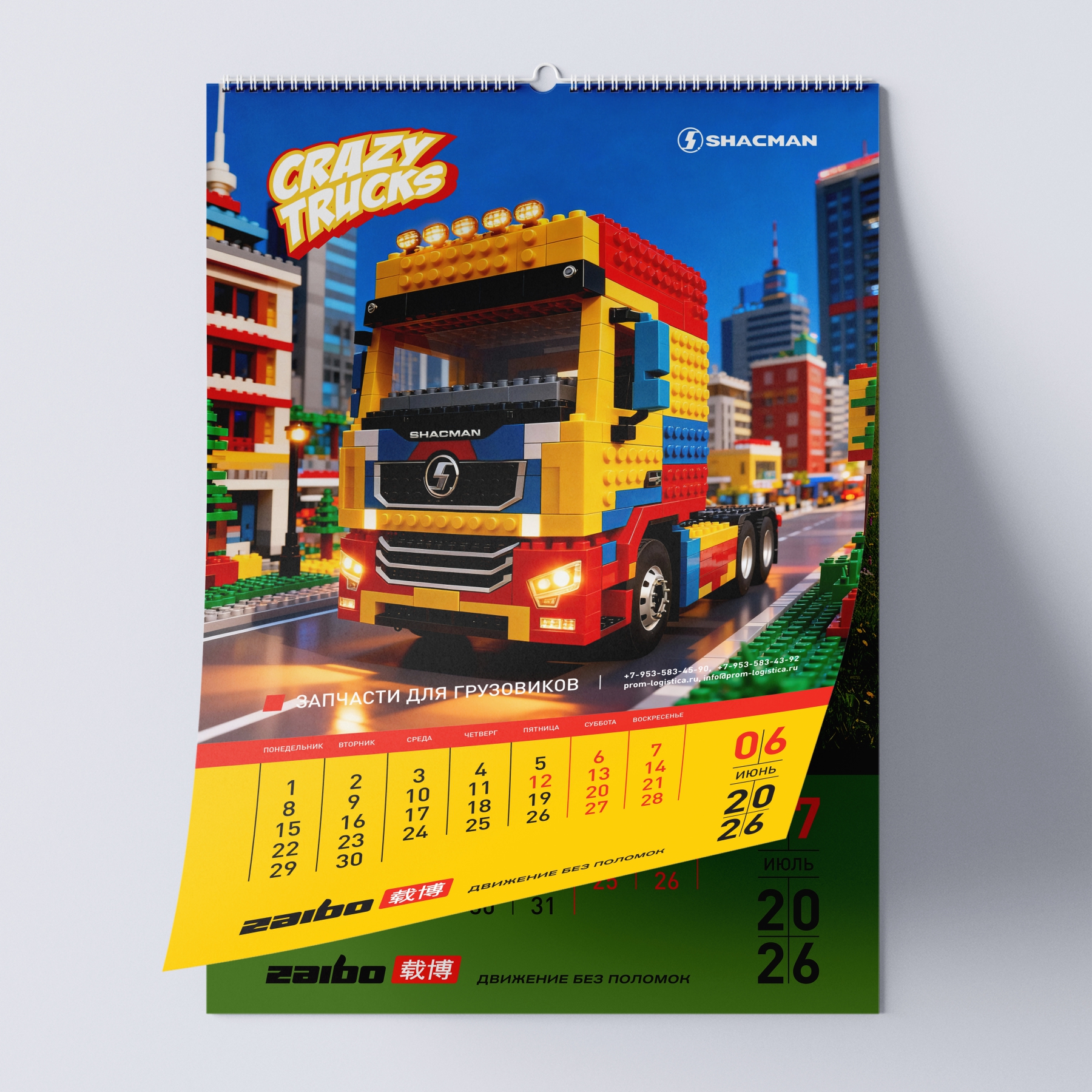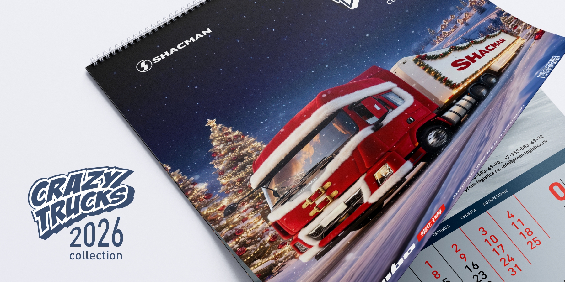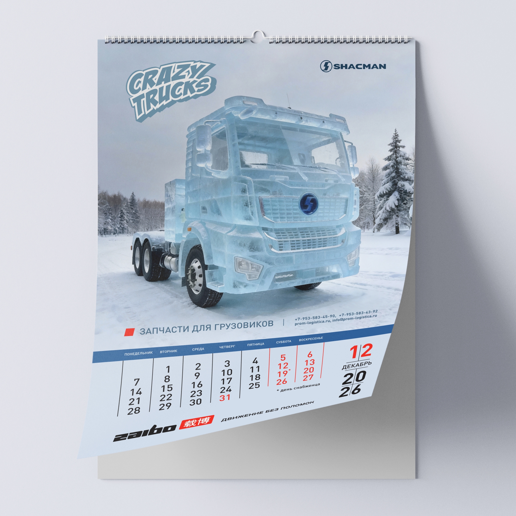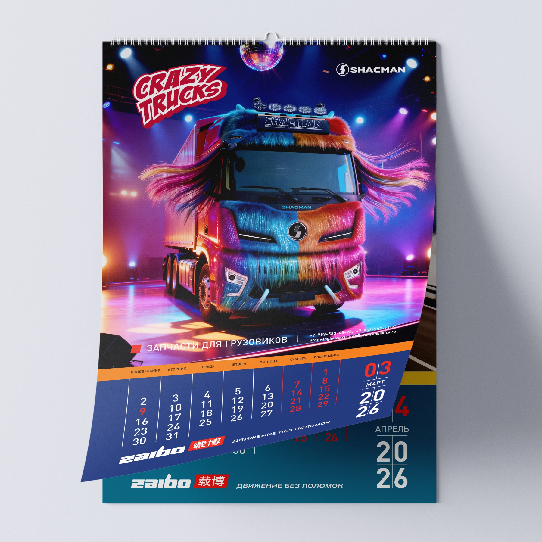 Наш кейс: создание перекидного календаря на 2026 год для бренда спецтехники ZAIBO. Уникальная концепция — 12 артов на основе фото грузовиков SHACMAN, стилизованных под дракона, огненную лошадь и других существ.